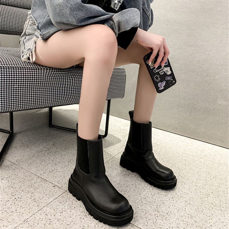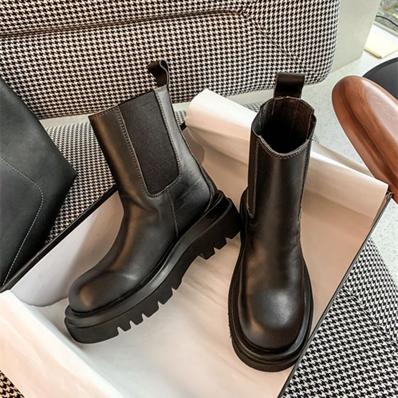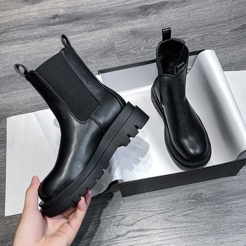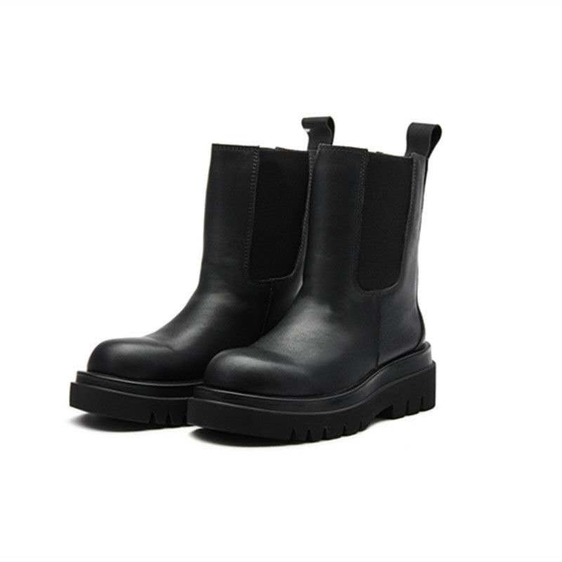 Stivaletti in pelle liscia nera con suola spessa robusta. Design moderno con punta arrotondata e dettagli elastici laterali per una vestibilità comoda. Ideali per look urbani e casual di tendenza.
